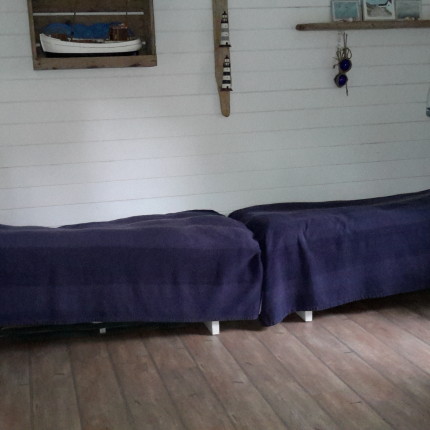 Indretning 1 stue med sofamøbler og med integreret køkken med spisebord på ca. 25 m2 + 1 soverum med  en dobbeltseng med springmadrasser og en enkeltseng med skumgummimadras. 1 stue på 1. sal med sofamøbler og en dobbeltseng.  I annekset er der 2 enkeltsenge. Opvarmning sker med 2 brændeovne med glaslåger. Desuden el-radiatorer. Brænde gratis til rådighed i høj- og mellemsæson.